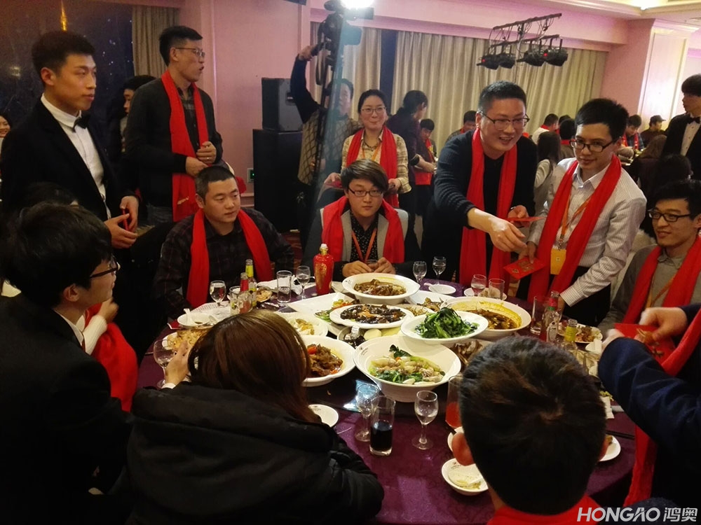 年会上表彰了优秀员工与优秀组长,任命2016年的中高层管理者,还有激动人心的表演节目,如小提琴表演,街舞表演,小品表演,还有鸿奥科技员工精心准备的歌唱环节更是把现场气氛带到最高点,掌声络绎不绝。大家欢聚一堂,举杯欢畅。随后,我们鸿奥科技总经理单总更是给大家带来意想不到的惊喜--发红包敬酒!祁董、单总还有人事行政部经理季青他们手捧酒杯,后面还带着手捧红包的“小财神“,来到每个酒桌面前开始派发红包并举杯欢饮。将我们的年会推向了最高潮!