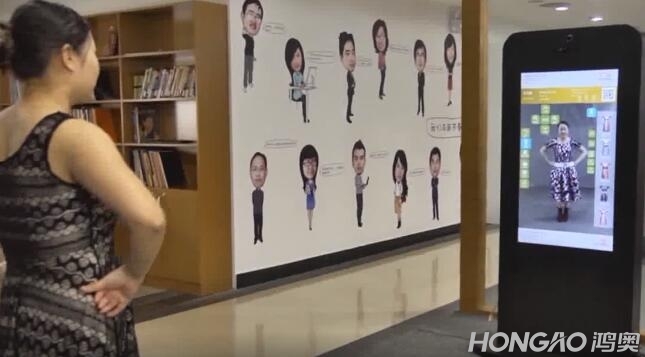 虚拟试衣系统只需要参与者站在前面举起双手就可以启动,左侧边是所有相对应的上衣、下装、包包等选项,右侧边会对应显示出来,参与者只需要隔空感应就可以更换衣服、包包等,