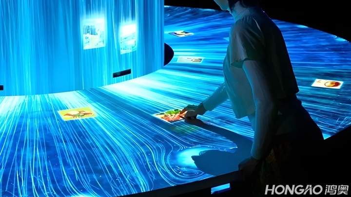 这是一种很常见的关于墙面互动投影形式,也是展厅中应用较多的一种,它可以是传统的信息展示,也可以是投影游戏,通过投影将游戏场景投射到墙面上,用户可以通过触摸或是泡泡球与之进行交互。
