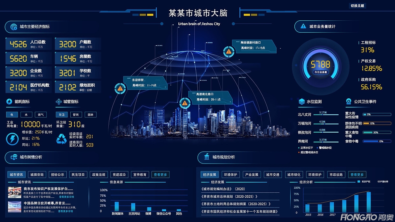 智慧城市数字可视化大屏,利用大面积、炫酷动态、丰富色彩的大屏展示,率先吸引大众目光,通过营造独特氛围,将数据、信息三维可视化动态呈现,使受众在获取精准信息的时候留下震撼、深刻的印象。